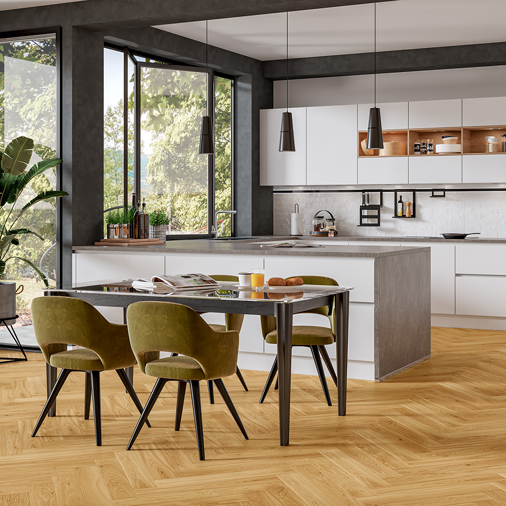Dřevěné podlahy Artisan jsou známé svou odolností a nadčasovým designem, který přežil mnohé módní trendy. S odstínem střední hnědé a vzorem rybí kosti dodá Vašemu interiéru moderní a jemný dojem. Zkosené hrany na všech čtyřech stranách podtrhují elegantní vzhled této podlahy.