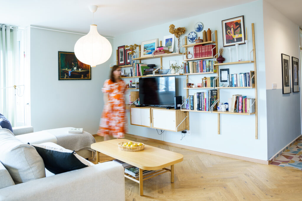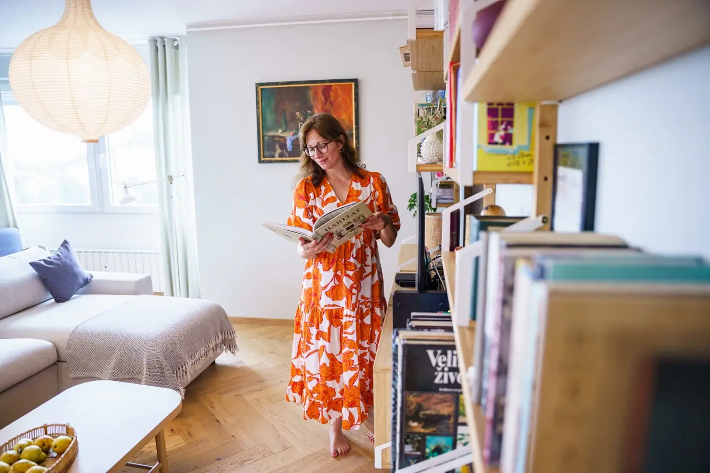 Při rekonstrukci bytu, kterou provedli interiérová stylistka Irena Dvoržak a její manžel, architekt, se zaměřili na otveření prostoru. Odstraněním stěn spojili kuchyň, obývací pokoj a jídelnu. Jako podlahu zvolili dubovou dřevěnou podlahu s většími lamelami, což prostoru dodává pocit větší propojenosti a šířky. Podlaha skládaná do vzoru rybí kosti směřuje pohled k terase s výhledem na Lublaň.