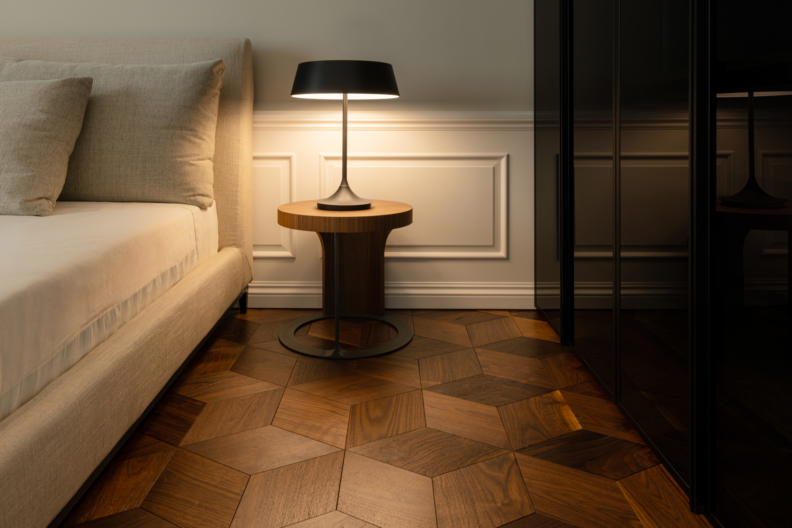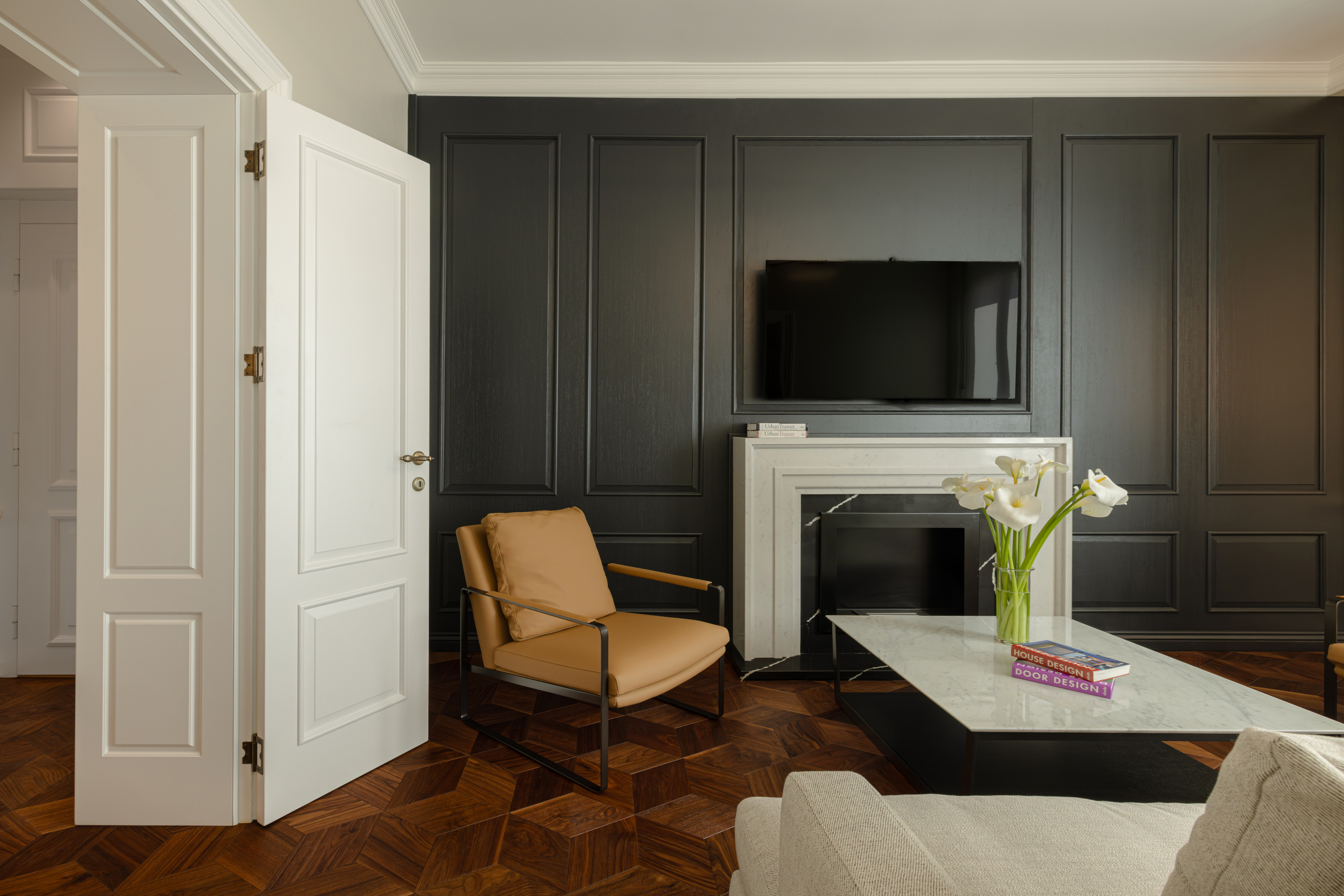 Zvláštní pozornost byla v projektu věnována interiérovému designu a výběru kvalitních materiálů. Jeden z bytů je vybaven naším prémiovým parketovým balíčkem Essence ve vzoru rybí kosti, který interiéru dodává luxusní charakter, teplo přírodního dřeva a nadčasovou eleganci.